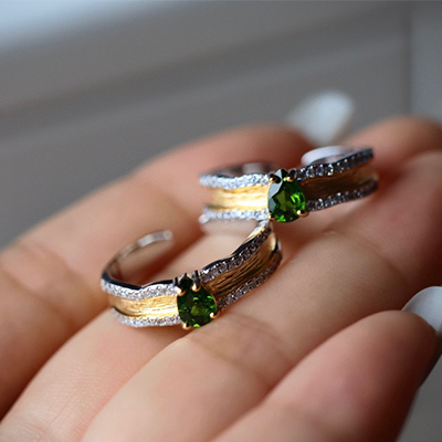 This exquisite Natural Diopside Ring showcases the gemstone’s signature rich green hue and crystalline transparency, set in gold-plated sterling silver for a luxurious yet understated appeal. The 4x6mm diopside is skillfully cut to enhance its brilliance, making it an eye-catching centerpiece.
